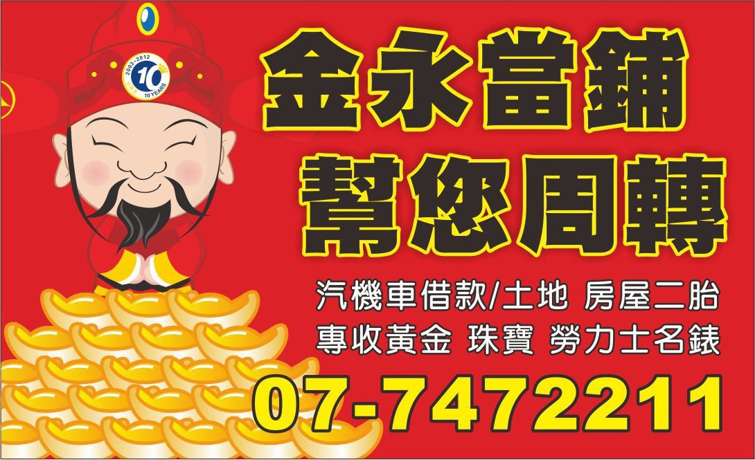 高雄金永當鋪完全透明的借、還款流程,營造安全的借款環境,讓許多客戶一走進來就感到親切又自在!金永為政府立案核准、高雄市當舖公會認證的優良當舖,服務項目包含救急三點半、工商融資週轉、降息代償、支票借款、名牌包、3C產品質借、高價收購黃金、鑽石名錶、汽機車借款、二胎房貸、房屋貸款等,解決了客戶個人或企業資金上的煩惱,讓您順利借款、輕鬆還款!